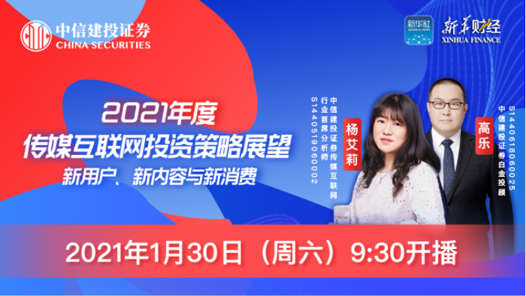 时间:2021年1月30日(周六)9:30。中信建投证券2021年度传媒互联网投资策略展望:新用户、新内容与新消费。本场直播将从传媒互联网行业角度进行年度市场展望,并对市场热点港股、流量、盲盒以及二次元经济等逐一解读,结合内循环、模式创新、中华文化软实力等方面解析未来的投资机会。